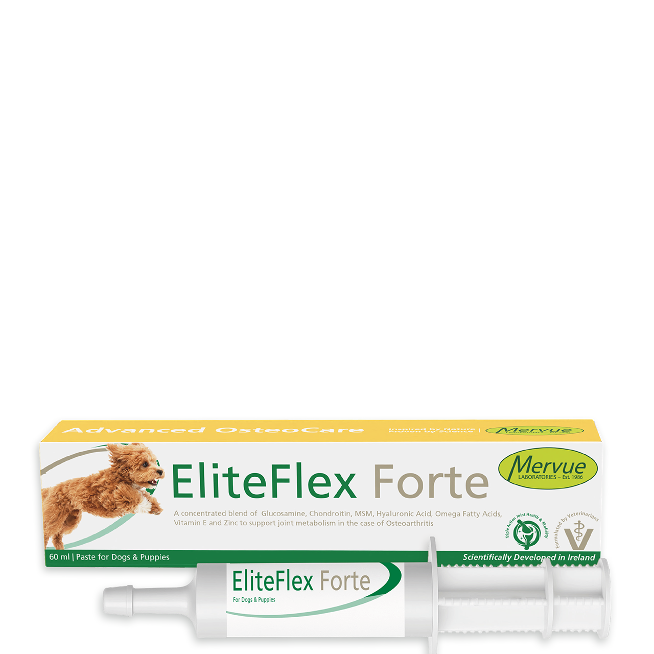 EliteFlex Forte has been specifically formulated for dogs to support maintenance of joints and cartilage from injury. Periods of high activity place additional demands and wear on the mobility of the dog. In addition natural ageing slows down the natural renewal process of the older dog.